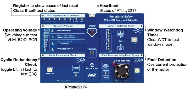 La dernière étape consiste à tester votre produit et à évaluer le niveau de sécurité qu'il fournit. La carte d’engagement sur le terrain de sécurité fonctionnelle AVR (ATAVRFEB-SAFETY), basée sur un MCU ATtiny3217, offre une plateforme tout-en-un pour démontrer et évaluer les caractéristiques de sécurité et de fiabilité disponibles sur les appareils PIC® et AVR. Au centre de la carte, l’indicateur de « ligne de vie de l’application » (Application Heartbeat) montre si l’application fonctionne correctement ou non. Une ligne de vie accélérée indique qu’un problème a été détecté, et une LED d’état s’allume pour signaler la cause de l’erreur. La carte possède cinq sections principales qui incluent des LED d’état pour la rétroaction d'utilisateur. Elle est alimentée par un câble USB 5,0V et composée d’un mini débogueur intégré embarqué (mEDBG) qui peut être utilisé pour programmer et déboguer le MCU ATtiny3217. Les pilotes pour la carte sont disponibles dans Atmel Studio 7. Cet outil de configuration intuitif, basé sur le web, facilitera le développement de votre application.