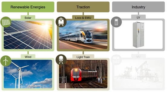 Les condensateurs de la gamme ModCap™ de TDK répondent aux besoins des concepteurs tant pour les IGBT que pour les SiC. Ces composants haute énergie ultra-compacts sont conçus pour répondre aux exigences de conception des convertisseurs de puissance destinés aux systèmes photovoltaïques et aux éoliennes, celles des onduleurs de traction utilisés dans les chemins de fer (trains légers, rames automotrices électriques) et des systèmes d’entraînement industriels (voir figure 2).