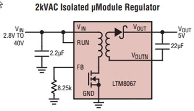 Analog Devices Inc. LTM8067 and LTM8068 μModule® DC/DC Converters are 2kVAC isolated flyback power modules. Included in the package are the switching controller, power switches, transformer, LDO, and all support components. These Analog Devices converters operate over a 2.8V to 40V input voltage range and support a 2.5V to 18V output voltage range, set by a single resistor.Features