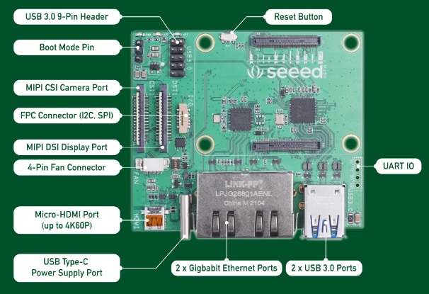 La carte porteuse gigabit Ethernet double de Seeed Studio est équipé de ports gigabit Ethernet doubles et de ports USB 3.0 doubles idéaux pour les applications de routeur logiciel. Cette carte porteuse est alimentée par le module de calcul 4 Raspberry Pi. La carte porteuse gigabit Ethernet double dispose d'un double USB 3.0 embarqué avec une embase USB 3.0 à 9 broches supplémentaire pour plus de ports externes. Cette carte porteuse offre une variété de périphériques E/S, notamment MIPI CSI, MIPI DSI et micro-HDMI pour connecter des afficheurs/caméras. Les autres périphériques comprennent une embase USB 3.0 à 9 broches standard pour une plus grande extension USB, un port pour carte micro-SD et un connecteur FPC. La carte porteuse double gigabit Ethernet est idéale pour les fabricants de HTPC, les développeurs Linux, les passionnés de routeurs logiciels et les utilisateurs Raspberry Pi. Les applications typiques incluent le routeur logiciel, l'Internet des objets (IdO) et les maisons intelligentes.Caractéristiques