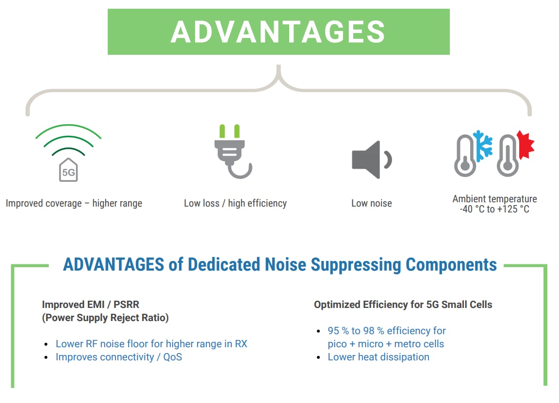 Les solutions d'alimentation Vishay 5G sont un portefeuille de composants qui offrent le plus haut rendement et les plus hauts niveaux de bruit RF pour les applications de stations de base mmWave 5G. Ils disposent d'une plage de température de fonctionnement élevée de -40°C à +125°C. Un filtrage large bande peut être atteint avec des condensateurs de filtre à ESR ultra-faible et des diodes à récupération progressive améliorent le PSRR et le plancher de bruit RF.